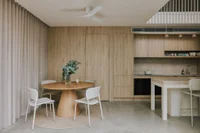 Each home appears to fully open on three sides, blurring the lines between inside and out, while above, a floating upper level accommodates bedrooms, providing natural shade and comfort to the living spaces below, marrying elegance with practicality in every detail.